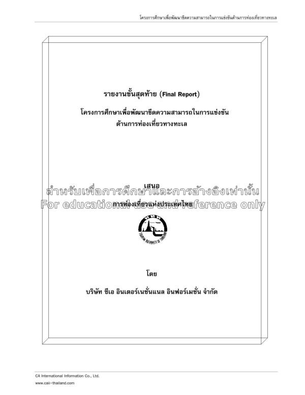 | 773 | | | ^tอนุสาร อ.ส.ท. / การท่องเที่ยวแห่งประเทศไทย. ^g ปีที่ 63, ฉบับที่ 4 (พ.ย. 2565), หน้า 62-75 ^x 01257226 |
